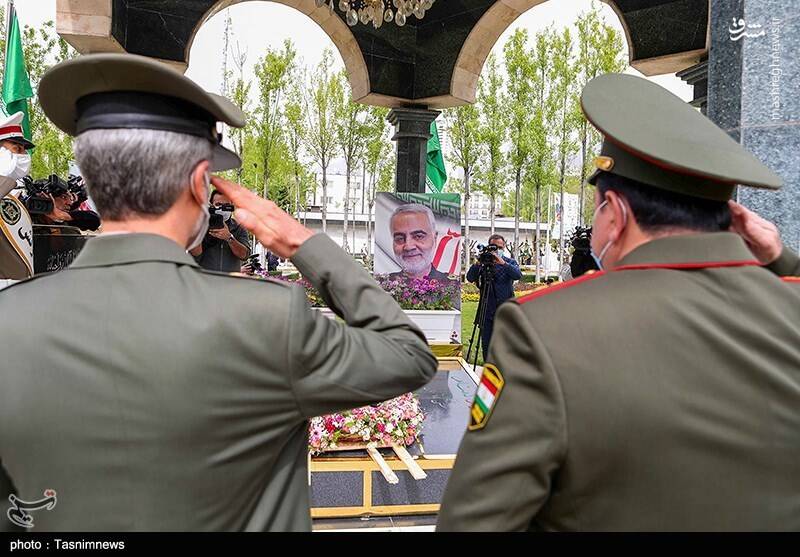 عکس/ ادای احترام وزرای دفاع ایران و تاجیکستان به شهید سلیمانی