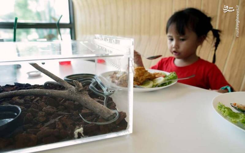 یک دختر بچه سه ساله در کافه تازه افتتاح شده«مار» در Siam Serpentarium بانکوک تایلند، غذا میخورد./ عکس: Rungroj Yongrit / EPA
