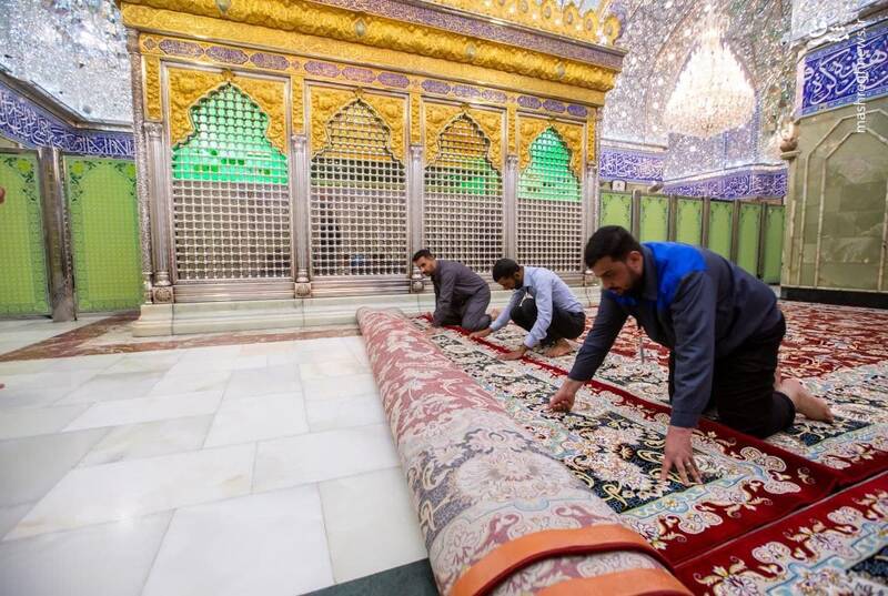 خادمان حرم مطهر حضرت عباس(ع) پس از شستشوی بخش های مختلف این بارگاه مقدس، حرم حضرت عباس(ع) را با فرش های جدید مفروش کردند.