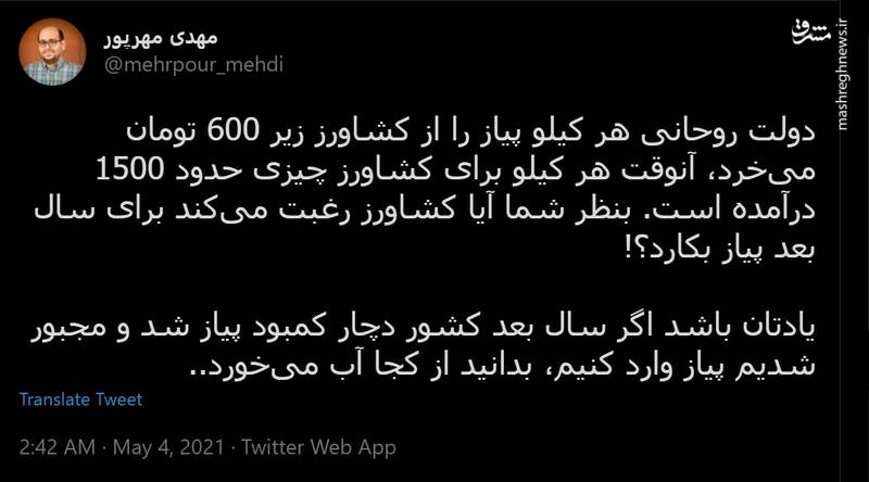 ، مهدی مهرپور در توئیتی نوشت: دولت روحانی هر کیلو پیاز را از کشاورز زیر ۶۰۰ تومان میخرد، آنوقت هر کیلو برای کشاورز چیزی حدود ۱۵۰۰ درآمده است. بنظر شما آیا کشاورز رغبت میکند برای سال بعد پیاز بکارد؟! یادتان باشد اگر سال بعد کشور دچار کمبود پیاز شد و…