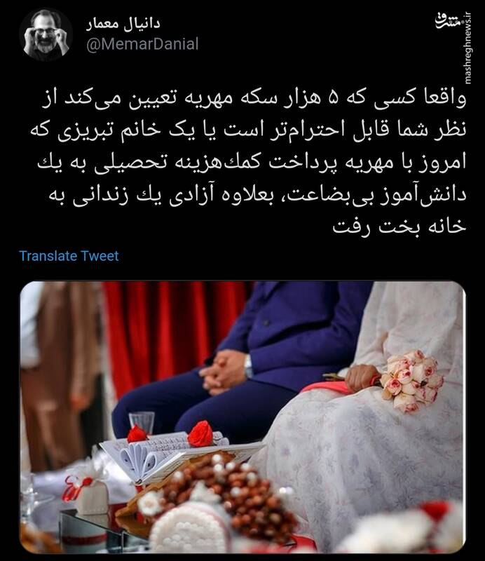دانیال معمار، فعال رسانهای در توییتر نوشت: کسی که ۵ هزار سکه مهریه تعیین میکند از نظر شما قابل احترامتر است یا یک خانم تبریزی که امروز با مهریه پرداخت کمکهزینه تحصیلی به یک دانشآموز بیبضاعت، بعلاوه آزادی یک زندانی به خانه بخت رفت. *بازنشر مطالب…